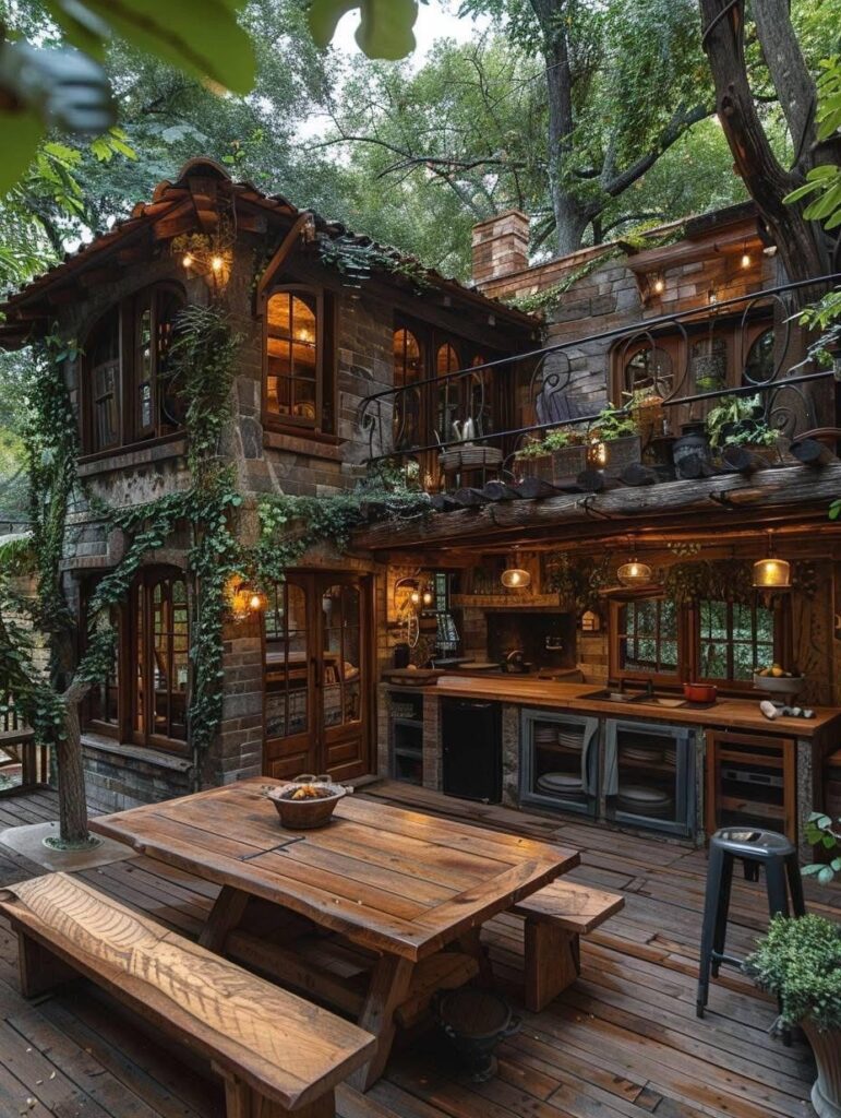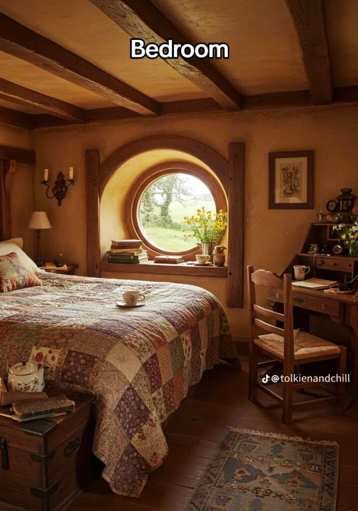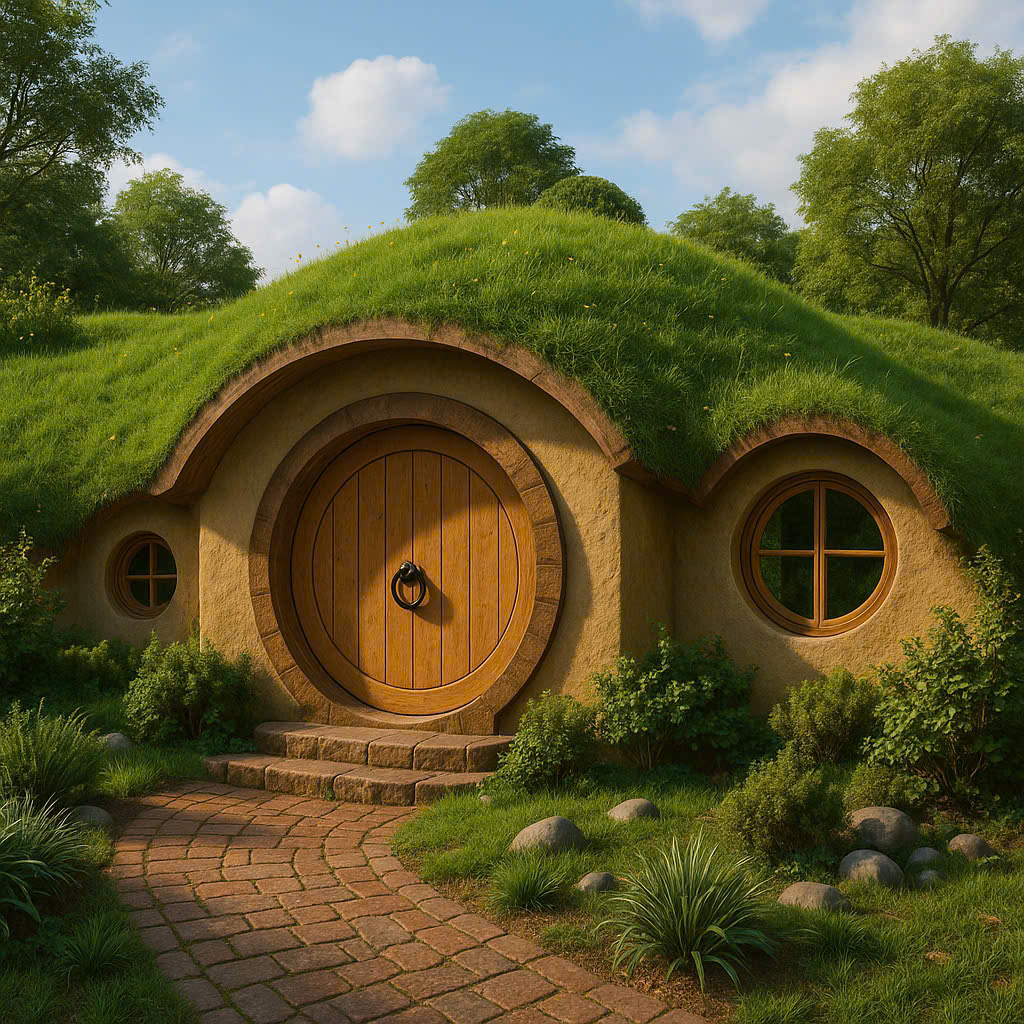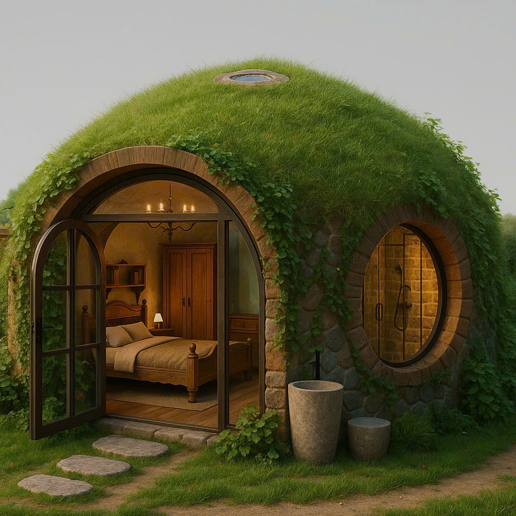 • Lấy cảm hứng từ thế giới trong phim The Hobbit – mái vòm cong, cửa tròn, ẩn mình trong sườn đất hoặc phủ cây xanh.